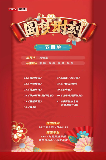 2023年4月16日,11个从“艺童才艺秀 环保向未来“”少儿环保才艺大赛评选活动中脱颖而出的精品节目参与北京广播电视台财经频道《圆梦时刻》环保专期录制,并于2023年6月24日08:35播出,节目精彩纷呈。孩子们精彩的表演,为首都公众呈现了一场环保和艺术紧密融合的视觉盛宴!同时进一步带动了更多的少年儿童和社会公众共同践行简约适度、绿色低碳、文明健康的生活方式。