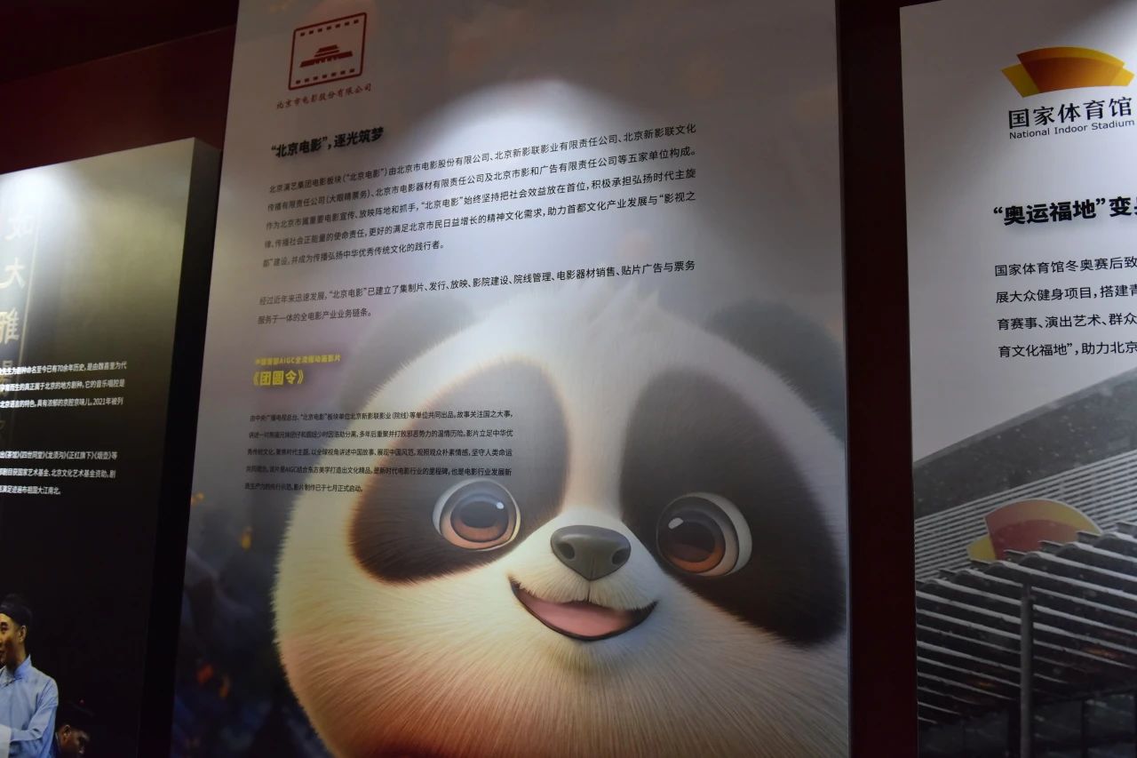 在京演集团主题展位上,“北京电影”与9家院团单位及国家体育馆,共同为观众与嘉宾展现了作为北京市直属国有大型文化旗舰企业北京演艺集团的风采与十五年来的改革发展所取得的丰硕成果。一只憨态可掬、质感十足的熊猫,让“北京电影”的介绍展板有了特别的意味,这是由“北京电影”板块单位新影联影业(院线)出品的中国首部AI全流程动画影片《团圆令》主角团仔的形象。该影片也是“北京电影”年度的重点项目之一,通过博览会这一平台进行展示与宣传。