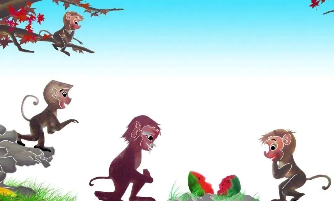 两个小猴子不认识西瓜,把拾到的西瓜当球玩,不小心打碎了。猴大王叫来了“见多识广”的老猴子,可谁也不知道西瓜是怎么个吃法。于是,你一言我一语地议论开了,你们猜,貌似聪明的猴大王吃了西瓜的什么部位?